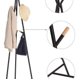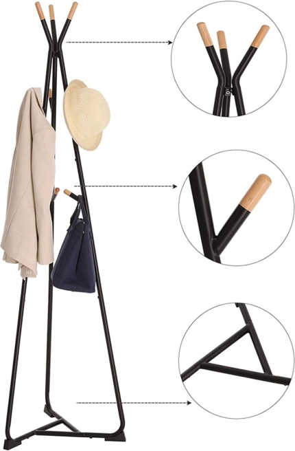 Masivní kovová konstrukce a trojúhelníková základna zajišťují výbornou stabilitu i při větším zatížení. Bezpečné nožky chrání podlahu před poškrábáním a háčky v různých výškách usnadní používání dětem i dospělým. Kompaktní rozměry 49 × 49 × 172 cm se skvěle vejdou i do menších předsíní.
