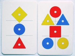 Skládej žetony různých tvarů a barev podle vzorové karty. Zapoj postřeh a paměť.