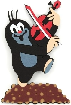 Kreativní design Krtečka s červenými houslemi, stojícího na hnědém kopci.