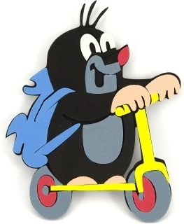 Barevná pěnová dekorace Krtečka na žluté koloběžce, která okouzlí každého dítěte.