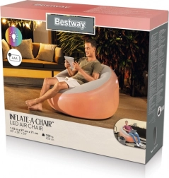 Stylové nafukovací křeslo se zabudovaným LED podsvícením promění každý interiér i terasu v útulnou zónu. Je lehké, skladné a díky pevné konstrukci a pohodlnému flokovanému povrchu nabízí skvělé pohodlí. Rychlý ventil usnadní nafukování a vypouštění, LED osvětlení se 7 barvami vytvoří atmosférické světlo pro relax i večerní posezení.