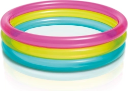 Nafukovací dětský bazének INTEX Rainbow je pestrobarevný a praktický pomocník pro letní dny. Díky třem průhledným prstencům je stabilní a pohodlný, zatímco kompaktní rozměry 86 × 25 cm se vejdou na většinu zahrad, teras i balkonů. Kapacita 68 litrů při doporučené výšce hladiny 17 cm zajišťuje bezpečnou a mělkou vodní plochu pro batolata.
