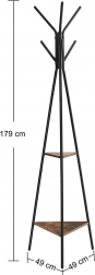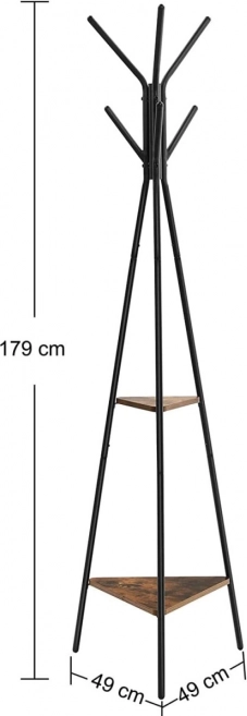 Stylový stojanový věšák v loft designu s kombinací kovu a dřeva se hodí do předsíně, šatny, obýváku i chodby. Nabízí 6 zaoblených háčků na kabáty a doplňky, 2 praktické police a stabilní trojnohý podstavec. Pevná železná konstrukce a odolné MDF zajistí dlouhou životnost, zatímco bezpečnostní nožky chrání podlahu.
