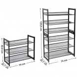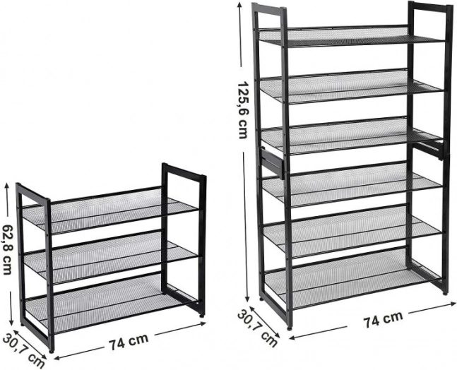 Díky robustnímu rámu z lakovaných železných trubek je botník stabilní, pevný a odolný vůči vlhkosti i deformacím. Síťované police podporují cirkulaci vzduchu, takže se boty lépe vysuší a nezapáchají. Potřebujete více místa? Dva stojany lze spojit a získat 6 polic.