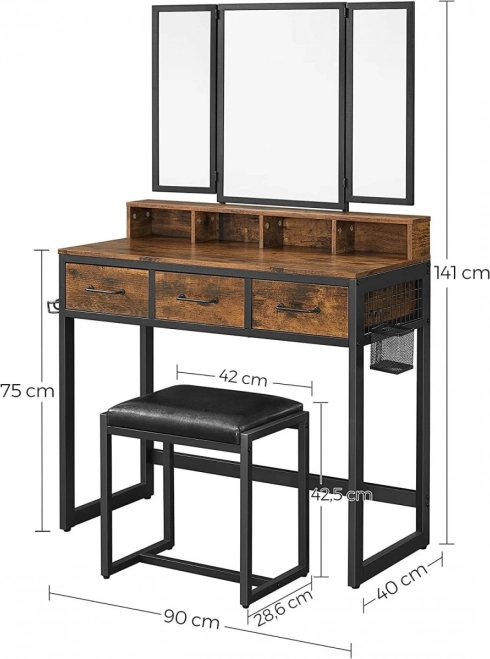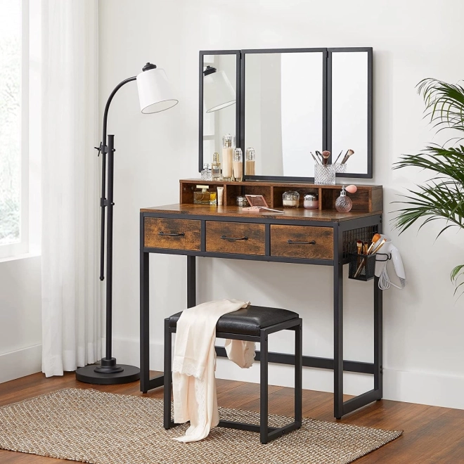 Vytvořte si svůj osobní beauty koutek. Tento toaletní stolek kombinuje rustikální dekor dřeva s černým kovovým rámem pro moderní, industriální vzhled. Trojdílné sklopné zrcadlo poskytuje perfektní úhel při líčení a po zavření chrání plochy před prachem. Boční křídla zrcadla mají háčky na náhrdelníky, pod horní deskou najdete přihrádky na nejpoužívanější kosmetiku.