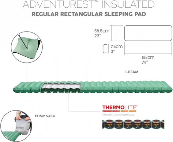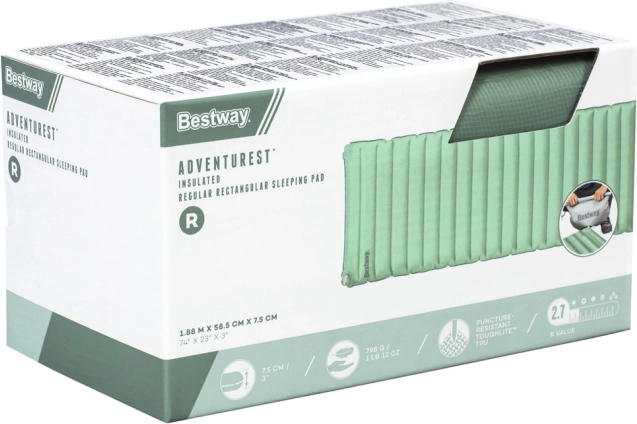 Nafukovací karimatka Bestway AdventuRest kombinuje pohodlí a funkčnost, což je perfektní volbou pro noclehy v přírodě. Je vyrobena z odolného materiálu ToughLite s ripstop tkaninou, která chrání před průniky. Součástí je také izolační vrstva ThermoLite zajisťující lehkost a teplo.