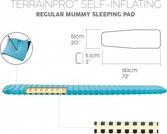 Tloušťka 5,1 cm a hodnota R 4,7 udrží teplo a poskytnou stabilní oporu i na nerovném podkladu. Ideální pro pohodlný spánek při kempování v chladnějším počasí.