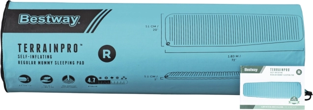 Hledáte spolehlivou karimatku na kempování a outdoorové výpravy? BESTWAY TerrainPro je samonafukovací karimatka, která kombinuje vysokou izolaci R 4,7, pohodlnou tloušťku 5,1 cm a odolnou konstrukci z ToughLite a 70D ripstop nylonu. Poskytuje stabilní oporu těla, skvěle izoluje od země a je kompatibilní s běžnými mumiovými spacáky.