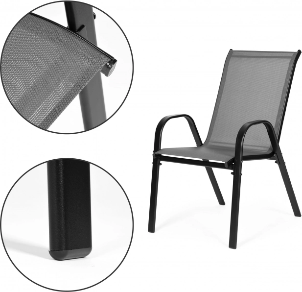 Textilní síťovinu, která tvoří sedák a opěradlo, je voděodolná a rychle schnoucí, takže snadno odolává dešti i ranní rose. Protišmykové nožičky chrání povrch podlahy před poškrábáním a zajišťují stabilitu při sezení. Díky možnosti stohování šetří místo při uskladnění v době, kdy se nepoužívají.
