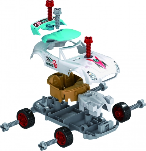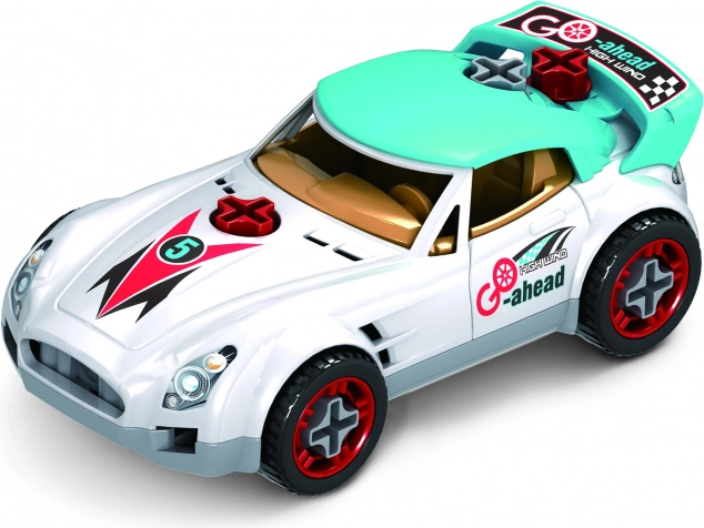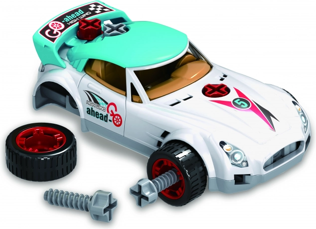 Šroubovací závodní auto 18 cm pro děti 3+. Součástí elektrický i manuální šroubovák, baterie 2× AA nejsou v balení. Rozvíjí motoriku a kreativitu.