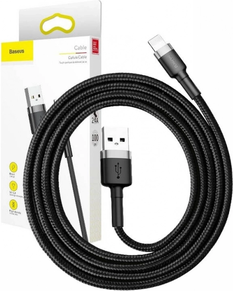 Odolný šedo‑černý kabel Baseus Cafule s konektory USB–Lightning nabízí rychlé nabíjení 2,4 A a přenos dat 480 Mb/s. Díky textilnímu opletu, hliníkovým konektorům a zesílenému ohybovému krčku je mimořádně trvanlivý, nezamotává se a spolehlivě propojí zařízení APPLE s Lightning portem s nabíječkami či počítači.