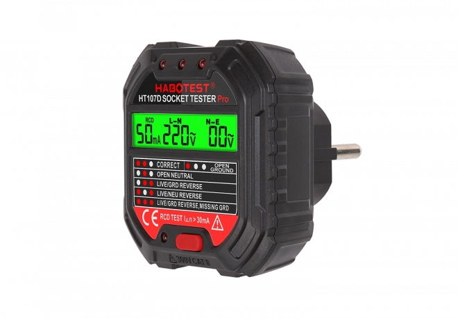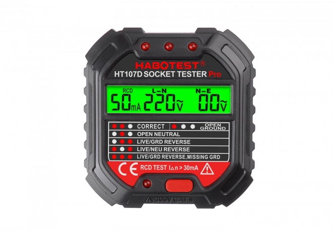 Zajistěte si bezpečnost a přehled o stavu elektrických zásuvek. Tester HABOTEST HT107D nabízí přehledný LCD displej s podsvícením, který zobrazuje aktuální napětí i výsledek testu zapojení. LED indikátory na horní straně jasně signalizují správné zapojení, chybějící ochranný vodič, přerušený nulový vodič či jiné chyby. Jediným stiskem tlačítka provedete také funkční test RCD.