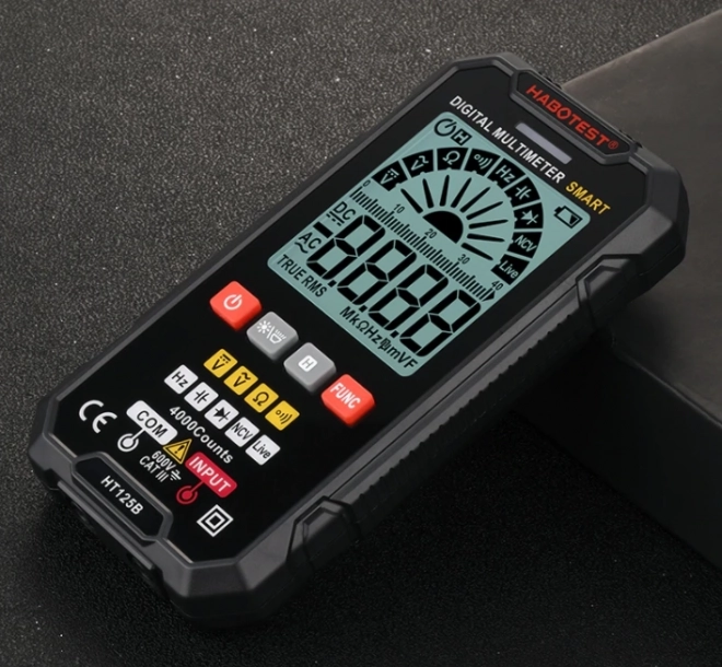 HABOTEST HT125B je chytrý a odolný multimetr navržený pro rychlou a přesnou diagnostiku. Vyniká tenkým tělem o tloušťce pouhých 19 mm, velkým čitelným displejem a příjemnými silikonovými tlačítky pro pohodlné ovládání. Díky vestavěné LED svítilně bezpečně pracujete i ve špatně osvětlených prostorech.