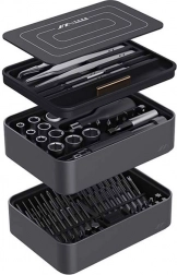 Pro přesné a šetrné práce u elektroniky sada obsahuje 3 typy pinzet a 2 klínovité páčicí čepele pro bezpečné otevírání zařízení bez rizika poškrábání. V další úrovni nechybí ráčnový klíč, rukojeť šroubováku, adaptéry a praktické nástavce. Dostupné jsou i nástrčné hlavice 5–13 mm a 8 základních 6,35mm bitů (H5, H4, H3, 5PH2, 5PH1, 3PH1, SL5, SL3).