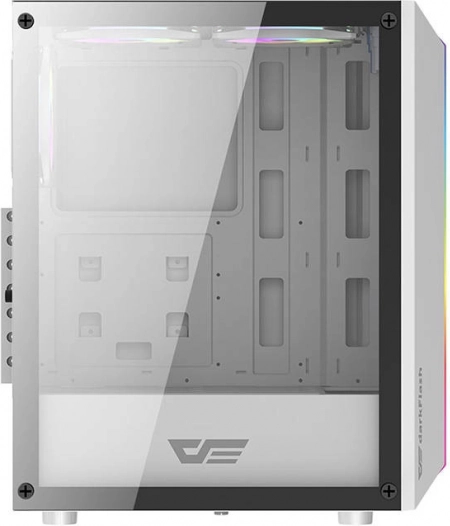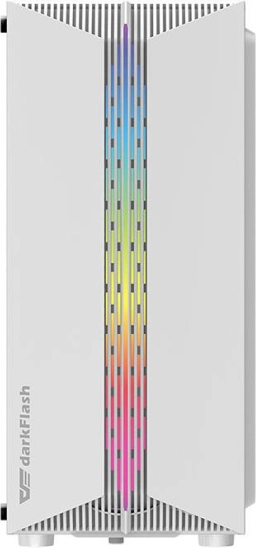 Skříň je promyšlená pro efektivní proudění vzduchu – z výroby obsahuje 3 ventilátory (DarkFlash C6 White) a podporuje až 6 pozic pro ventilátory i instalaci vodního chlazení (až 360 mm vpředu). Vnitřní prostor bez potíží pojme GPU do 290 mm a chladič CPU do 160 mm. Samozřejmostí je praktický I/O panel s USB 3.0, USB 2.0, audio konektory a tlačítky napájení, reset a LED.