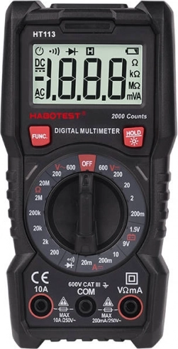 Lehký a praktický digitální multimetr Habotest HT113 pro rychlé a bezpečné měření v domácí dílně i při profesionálních pracích. Umožňuje přesně měřit DC/AC napětí, DC proud, odpor, testovat diody a spojitost. Nabízí funkci HOLD pro uložení dat, podsvícený displej, automatické vypnutí a indikátor slabé baterie. Odolné měkké pouzdro zvyšuje ochranu proti opotřebení a pádům, integrovaný stojánek usnadňuje práci na stole.