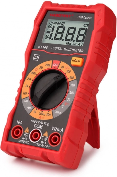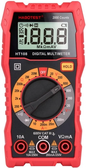 HABOTEST HT108L je univerzální multimetr s počtem zobrazení 2000 counts, který výrazně usnadní diagnostiku i běžné elektro práce. Nabízí přesná měření stejnosměrného i střídavého napětí až do 600 V, odporu do 20 MΩ, a podporuje akustický test spojitosti i testování diod. Díky podsvícenému displeji jsou hodnoty čitelné i v horších světelných podmínkách.