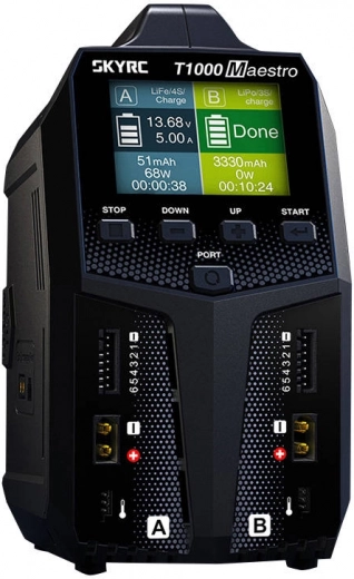 Nabíječka SkyRC T1000 Maestro posouvá hranice rychlého a bezpečného nabíjení akumulátorů pro RC modely. Nabízí duální kanály s inteligentním rozdělením proudu až do 35 A9× (AC) a 20× (DC) rychlejší než běžné nabíječky a plnou kompatibilitu s populárními chemiemi článků včetně LiPo/LiFe/LiIon/LiHV, NiMH/NiCd a Pb.