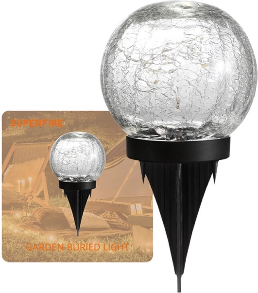 Stylová kulová solární lampa SUPERFIRE s čidlem soumraku zajistí automatické svícení po setmění, je energeticky úsporná a díky krytí IP65 vodotěsná. Nabíjí se ze slunce a její baterie 600 mAh poskytne příjemné osvětlení bez účtů za elektřinu.