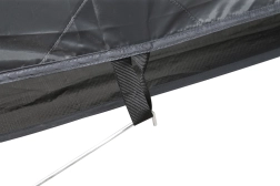 Promyšlené detaily zvyšují komfort při používání. Uvnitř najdete 4 prostorné kapsy na telefon, ovladač vířivky, ručníky či doplňky. Rozměr 390 × 390 cm poskytuje velkorysý půdorys nejen pro vířivku, ale i pro posezení. Materiály a spoje jsou navrženy pro snadnou údržbu a dlouhou životnost, takže pavilon spolehlivě obstojí během celé sezóny.
