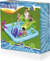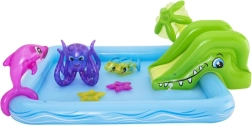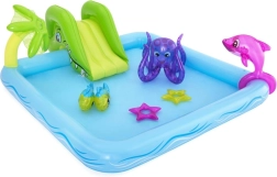 Rozveselte zahradu díky dětskému nafukovacímu vodnímu hřišti BESTWAY s motivem mořského akvária. Nabízí odnímatelnou skluzavku, vodní fontánu po připojení hadice a spoustu nafukovacích hraček (delfín, chobotnice, rybky a hvězdičky) pro hodiny zábavy v horkých dnech. Odolný materiál PVC, bezpečnostní ventily a snadné vypouštění vody zajišťují pohodlné a bezpečné používání.