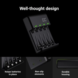 Chytrá mechanika drží baterie pevně na místě a usnadňuje jejich vkládání i vyjímání. Odolné ABS tělo s protiskluzem a pokročilé bezpečnostní obvody (tepelná, proti přepětí a proti zkratu) chrání vás i vaše akumulátory a zajistí dlouhou životnost.