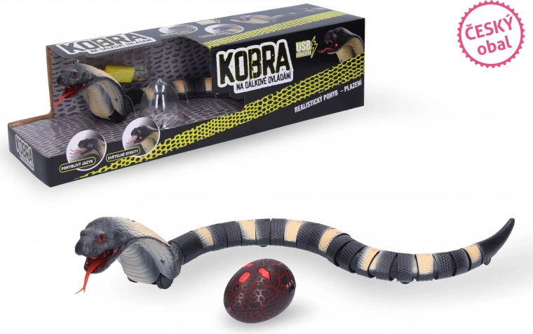 Realistická RC kobra na dálkové ovládání o délce 48 cm přináší spoustu zábavy i legrace. Díky realistickým pohybům, svítící tlamě a mrskajícímu jazyku vypadá jako živá. Snadné nabíjení přes USB, ovladač ve tvaru vejce je součástí balení.