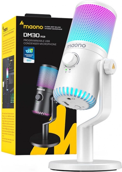 MAONO DM30 RGB je kompaktní stolní mikrofon, který kombinuje profesionální kvalitu nahrávání s atraktivním designem. Nabízí 7 barev a 5 gradientů RGB, takže dokonale zapadne do vašeho herního setu, a díky kardioidnímu snímání spolehlivě potlačí okolní hluk a zvýrazní váš hlas.