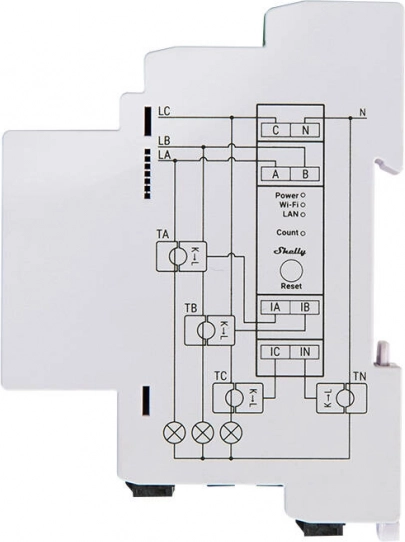 Shelly Pro 3EM 120 A je spolehlivý třífázový elektroměr pro detailní dohled nad spotřebou. Měří napětí, proud i činný/zdánlivý výkon v reálném čase na každé fázi, vyhodnocuje účiník a ukládá minutová data až 60 dní pro přesnou analýzu. Díky podpoře LAN, Wi‑Fi a Bluetooth jej snadno připojíte do sítě i bez nutnosti cloudu.