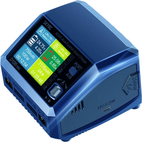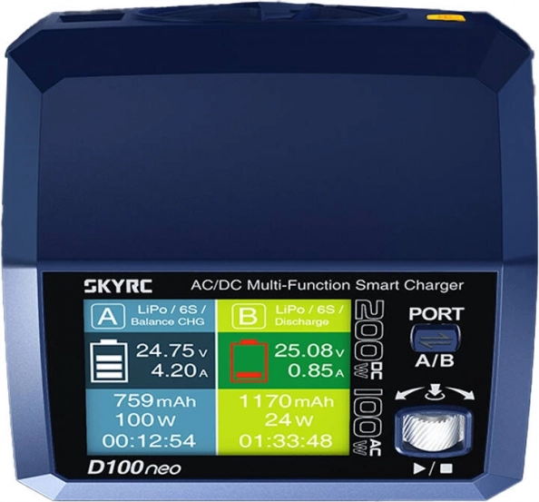 SKYRC D100neo spojuje vysoký výkon s kompaktními rozměry. Každý kanál zvládne proud až 10 A a při napájení stejnosměrným zdrojem dodá nabíječka až 200 W (2 × 100 W). Při napájení střídavým proudem inteligentně rozděluje až 100 W mezi oba porty. Přesné balancování ±0,02 V zajišťuje rovnoměrné nabití článků a delší životnost baterií.