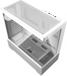 Skříň podporuje základní desky ATX, M-ATX i ITX a nabízí velkorysý prostor pro moderní grafické karty (až 425 mm) a věžové chladiče CPU do 170 mm. Flexibilní úložiště pojme 2× 3,5" HDD a 2× 2,5" SSD, zatímco spodní poloha zdroje zajišťuje čistý cable management. Horní panel poskytuje rychlý přístup k USB‑C, USB 3.0, USB 2.0, HD Audio a ovládacím tlačítkům.