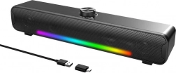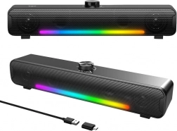 Moderní Bluetooth 5.3 zajistí stabilní bezdrátové spojení až do 15 metrů, zatímco intuitivní otočný ovladač umožní plynulé řízení hlasitosti, rychlou volbu světelných režimů a pohodlné přepínání režimů přehrávání. Díky štíhlým rozměrům 380 × 68 × 80 mm se soundbar snadno vejde pod monitor a ušetří místo na stole.