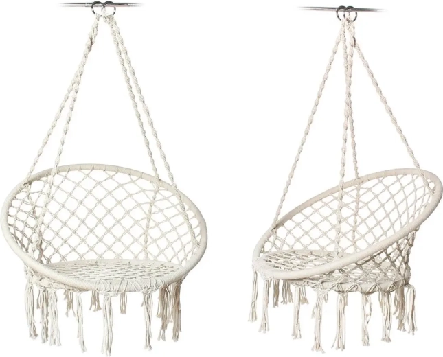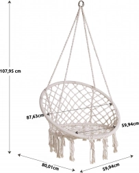 Bílý makramé styl s třásněmi působí dekorativně a lehce. Křeslo skvěle zapadne do boho interiéru i na venkovní posezení.