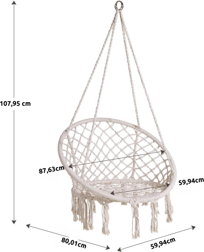 Prostor k sezení je štědrý – rozměry 60 × 80 × 115 cm (23.6" × 31.5" × 45.2") poskytují pohodlí dětem i dospělým. Nosnost 150 kg zaručuje bezpečné a univerzální použití. Součástí balení je kompletní montážní příslušenství pro uchycení do zdi, stropu či dřeva.