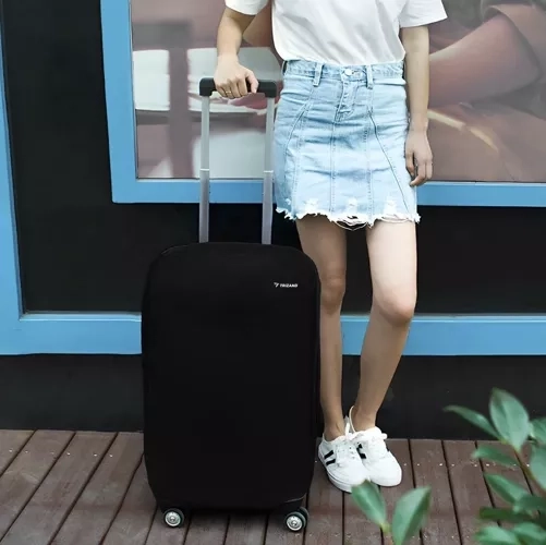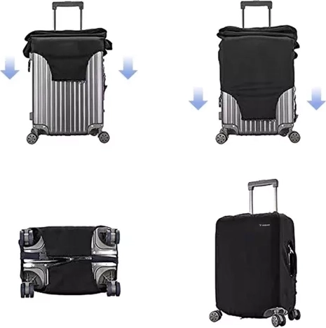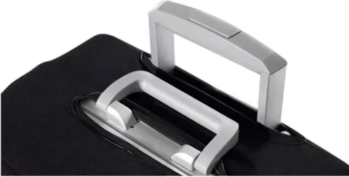 Díky přesným výřezům pro horní i boční madla a teleskopické držadlo můžete kufr používat bez sundávání potahu. Černá barva působí elegantně a zároveň usnadňuje personalizaci a rychlé rozpoznání na pásu. Vhodné pro střední kufry velikosti L v rozmezí 67–70 × 45–50 × 26–30 cm.