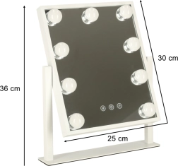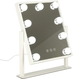 Elegantní kosmetické zrcadlo ve stylu Hollywood s 9 LED žárovkami poskytuje rovnoměrné a přirozené osvětlení pro bezchybný make-up. Dotykový panel umožňuje změnu teploty barvy (studená/teplá/neutrální) i plynulé stmívání. Stabilní kovová konstrukce, USB napájení a praktický rozměr 25 × 30 cm dělají ze zrcadla stylový a funkční doplněk každé toaletky.