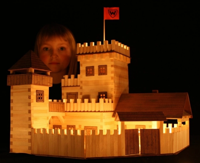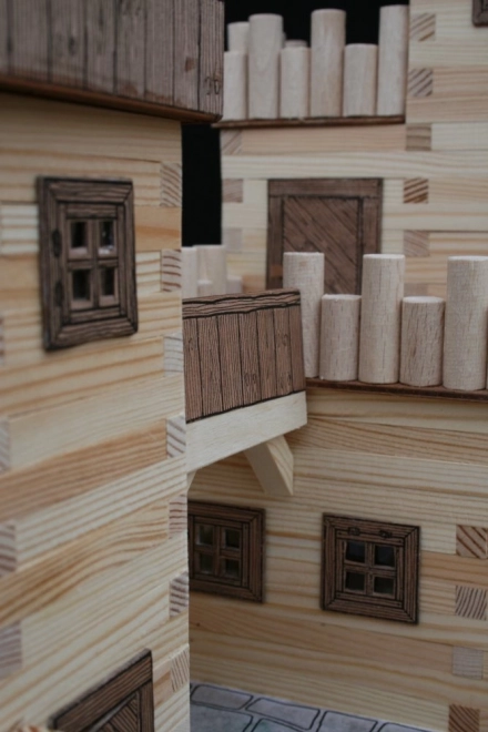 Dřevěné hranolky 9×9 mm a papírové doplňky (okna, dveře, střechy) zajišťují věrný vzhled středověké architektury.