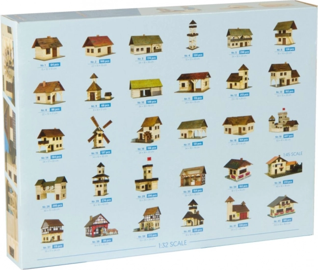 - Dřevěné díly, papírové doplňky, montážní návod, informační kapitoly o architektuře