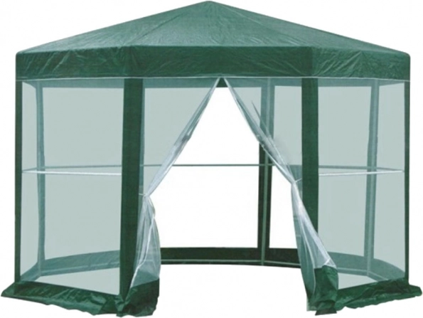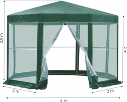 Elegantní zahradní pavilon ModernHome se šestihrannou konstrukcí a rozměrem cca 4 m v průměru nabízí prostorný, vzdušný a stinný kout pro posezení. Díky síťovaným stěnám proti hmyzu, odolnému PE potahu a stabilnímu ukotvení k zemi je ideální pro zahradní párty, oslavy i komerční využití. Vstup na zip zajišťuje pohodlný průchod a ochranu před hmyzem.