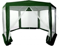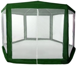 Šestiúhelníkový půdorys s průměrem cca 4 m poskytuje dostatek místa pro stůl a křesla. Síťované stěny zajišťují proudění vzduchu a ochranu před hmyzem.