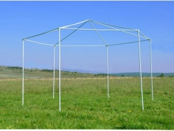 Zacvakávací konstrukce umožňuje sestavení zhruba za 25 minut bez nářadí. Patky sloupků a kolíky zajistí spolehlivé ukotvení do země.