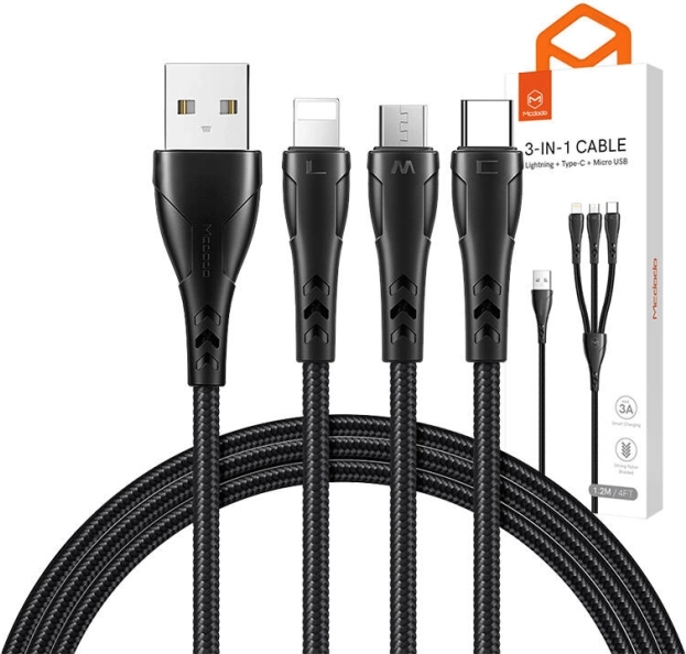 Jeden kabel, tři konektory – s USB‑C, Lightning a Micro USB pokryjete většinu moderních zařízení: smartphony, tablety, bezdrátová sluchátka či powerbanky. Kabel zvládne napájet až tři zařízení najednou, takže ušetří místo i čas.