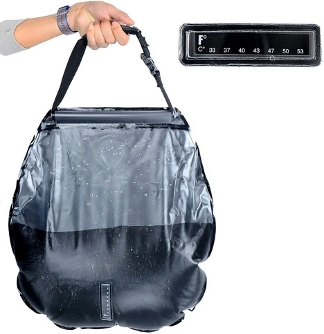 Solární sprcha o objemu 20 litrů zajistí několik minut komfortního oplachu po sportu, koupání v moři či při kempování. Voda se ohřívá čistě sluneční energií a teplotu snadno zkontrolujete na integrovaném teploměru (°C/°F). Průhledná zadní stěna umožňuje hlídat množství i čistotu vody.