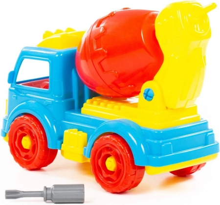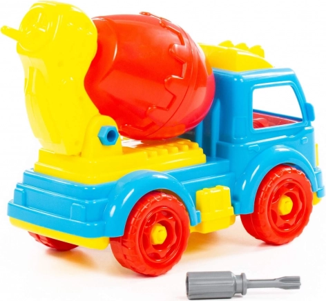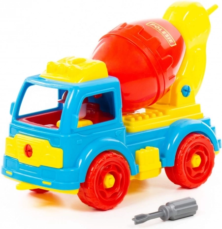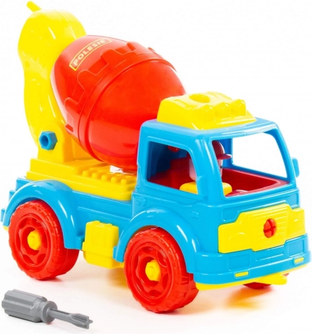 Zábavná plastová míchačka pro malé stavitele rozvíjí jemnou motoriku, logické myšlení a kreativitu. Děti si vozidlo mohou samy rozebírat a skládat pomocí šroubováku, otáčet funkční míchací nádobou a hrát si s přiloženou figurkou stavbaře.