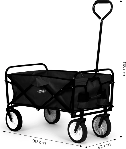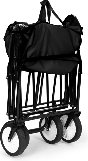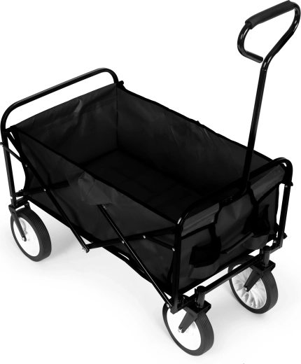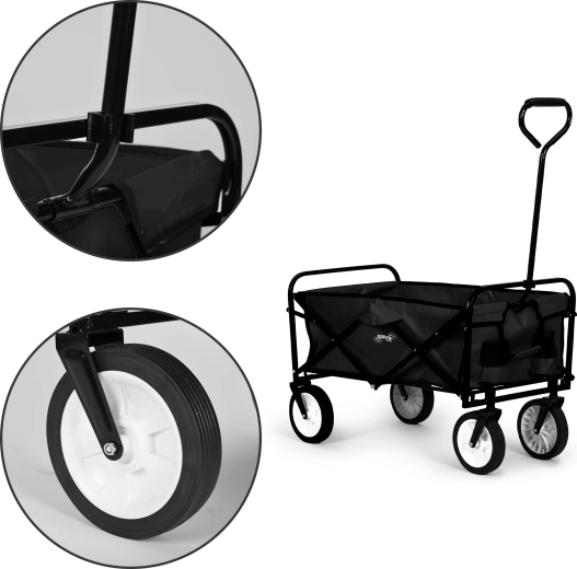 Vozík má otočná kola o 360° pro snadné manévrování i v úzkých prostorech, voděodolný materiál pro použití za každého počasí a široké pohodlné madlo pro jistý úchop. Po použití ho během chvilky složíte do kompaktní velikosti, takže nezabere téměř žádné místo.