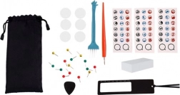 Obsahuje škrabku, štětec na čištění, unikátní samolepky, pravítko s lupou a špendlíky, vše v praktickém pytlíku.