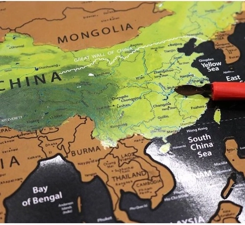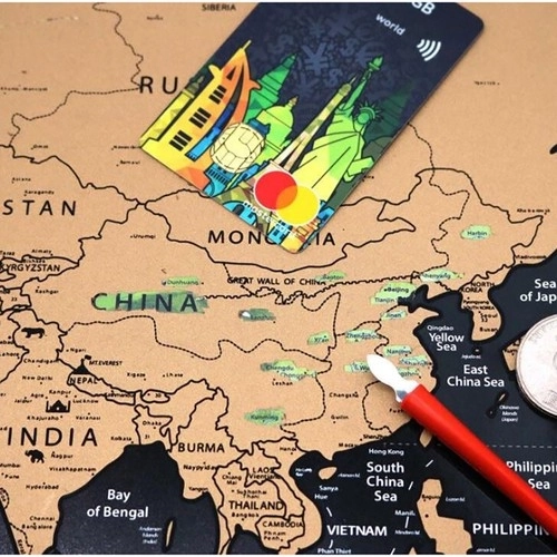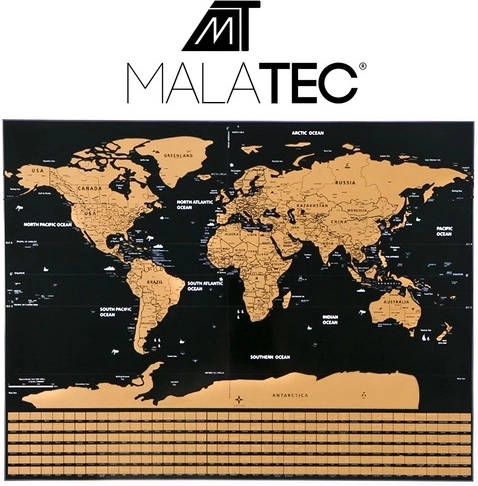 Stíratelná mapa umožňuje označit navštívené země a odhalit skryté geografické detaily a vlajky pod vrstvou.