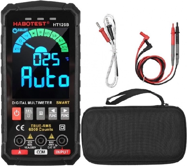 Multimetr HABOTEST je navržen pro přesné a pohodlné měření v terénu i v dílně. Díky true‑RMS poskytuje spolehlivé výsledky i u nelineárních průběhů, 6000 counts zajišťuje jemné rozlišení a velký VA displej s podsvícením skvěle čitelný přehled hodnot. Silikonová tlačítka, LED svítilna a kompaktní tělo (cca 146 × 72 × 26 mm, 182 g) zvyšují komfort i v horších podmínkách.