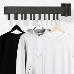 Elegantní nástěnný sušák v černém matu je řešením pro malé i větší prostory. Díky čtyřem sklopným ramenům s nastavitelným úhlem a teleskopickému výsuvu snadno přizpůsobíte sušící plochu aktuální potřebě. Stabilní konstrukce z odolného hliníku zajišťuje dlouhou životnost doma i na balkoně.