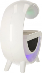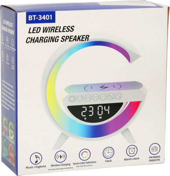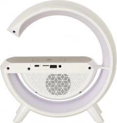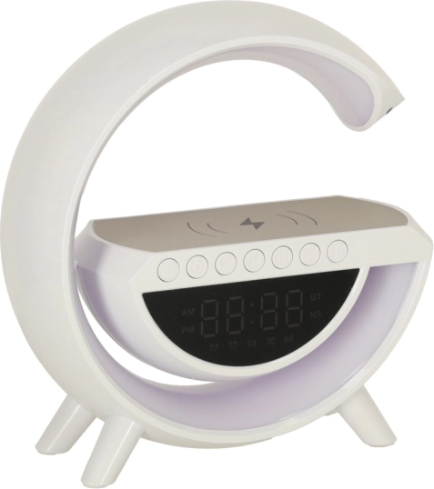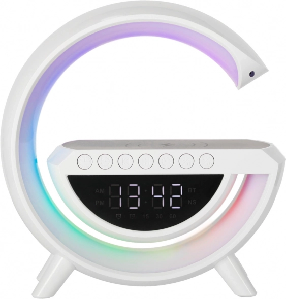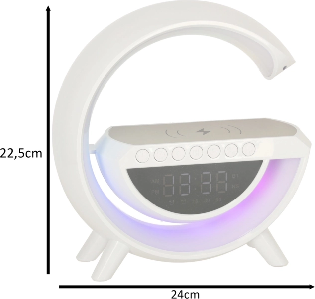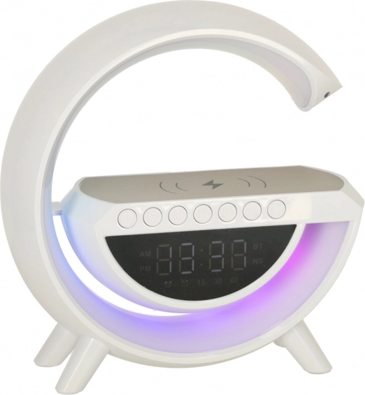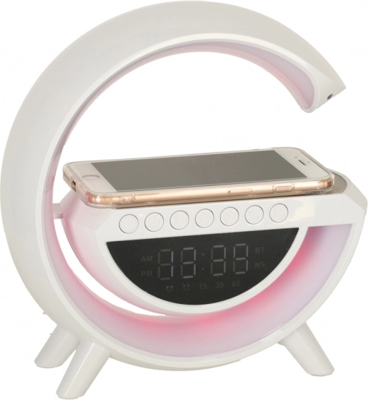 Multifunkční LED RGB lampička kombinuje bezdrátovou nabíječku Qi, digitální hodiny s budíkem, FM rádio, Bluetooth reproduktor a ambientní noční osvětlení v jednom stylovém zařízení. Nabízí 7 barev a 13 světelných režimů, generátor bílého šumu pro klidný spánek a pohodlí díky vestavěné baterii.